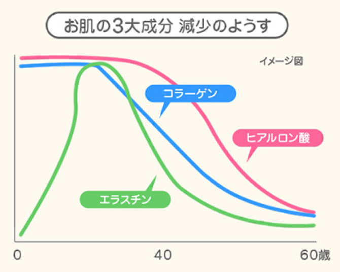 線維芽細胞は年齢とともに数が減少し、かつ3要素を生成する機能も低下していきます。これにより、お肌のハリや弾力・潤いが失われ、シワやたるみ、シミなどが出現します。これがお肌の「老化」です。